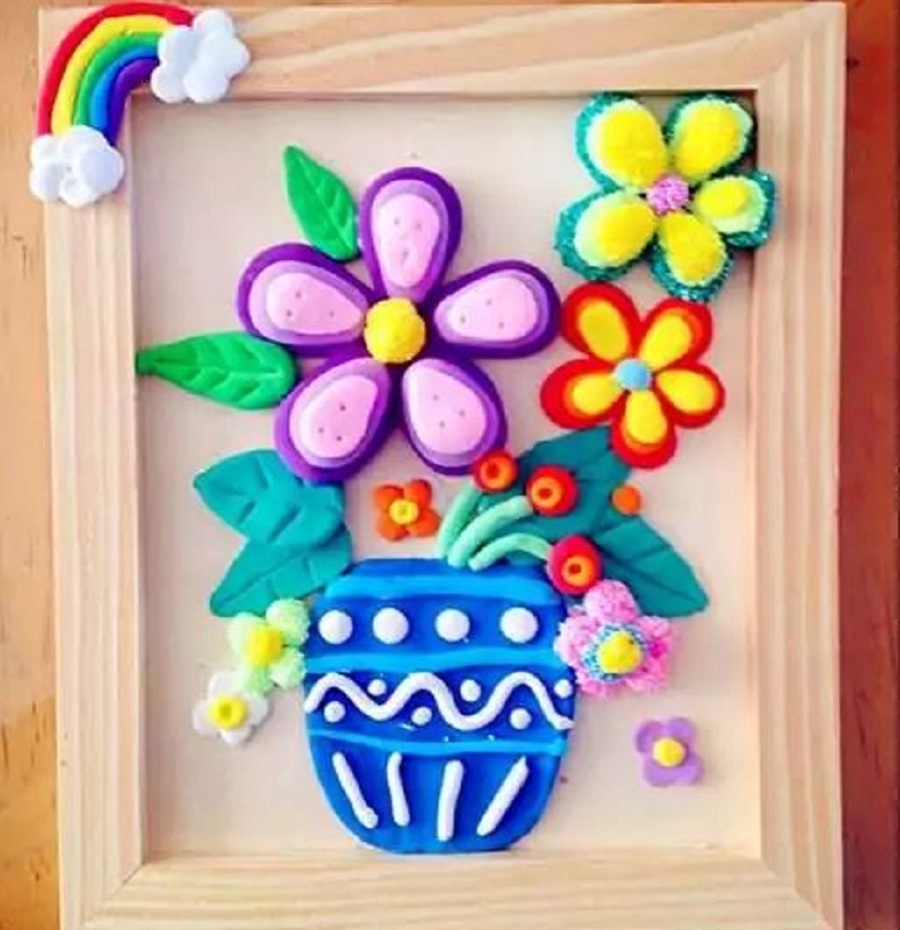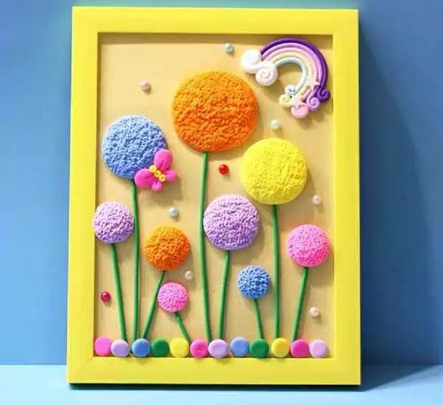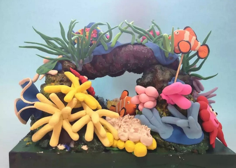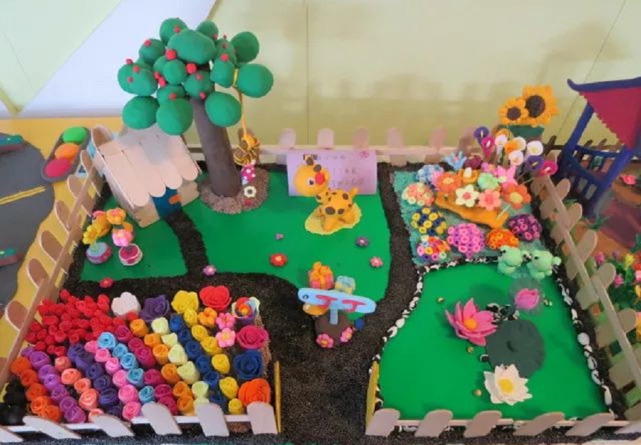 ——紅的、黃的泥巴變成一朵朵小花,一條條小魚,真的好玩!