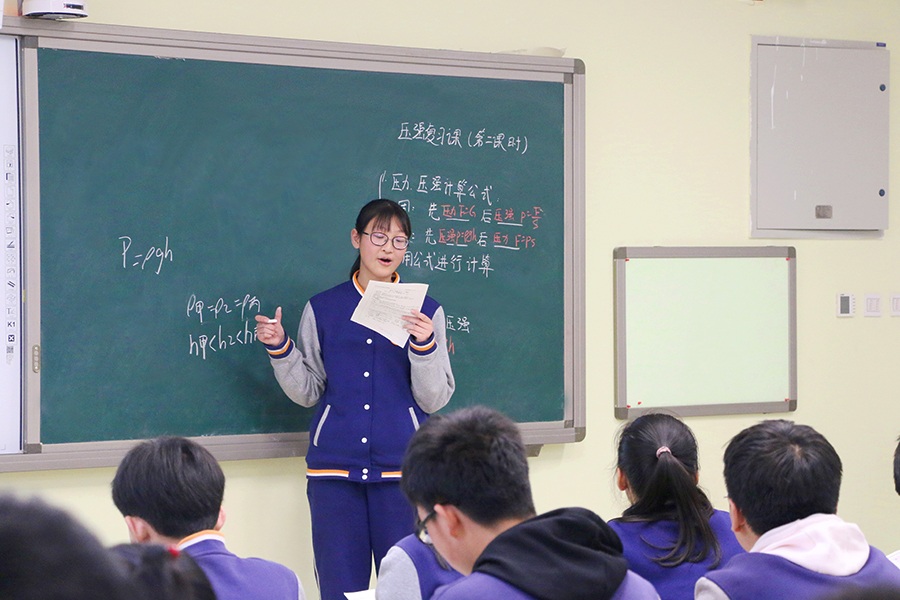 隨后在群學(xué)的展示環(huán)節(jié)中,學(xué)生們采用“我提問(wèn)”、“我回答”、“我補(bǔ)充”、“我質(zhì)疑”的方式,積極發(fā)言、踴躍展示思考成果。部分學(xué)生 “栽”在“導(dǎo)學(xué)提綱”的難題中,分別由呂木真和王奕豪同學(xué)來(lái)臺(tái)前“回答”,臺(tái)下的學(xué)生接連點(diǎn)頭,表示理清了水平桌面上的均勻柱體的壓強(qiáng)計(jì)算問(wèn)題,即用P=ρgh進(jìn)行計(jì)算,同時(shí)找到知識(shí)點(diǎn)的三個(gè)變式。展示過(guò)程中,學(xué)生們自信積極、語(yǔ)言流暢、思路清晰。