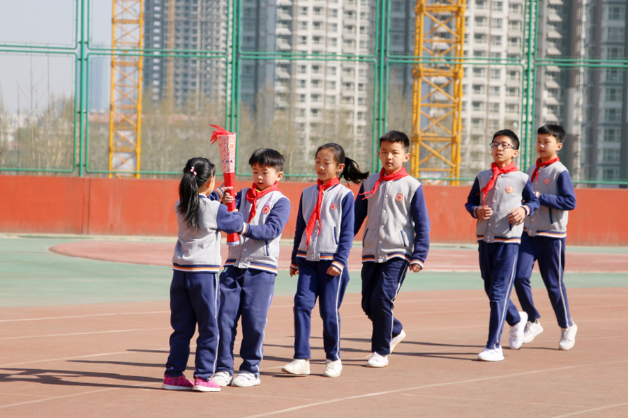 隨后,進(jìn)行的是第三屆春季運動會火炬?zhèn)鬟f儀式。全校選拔出六名火炬?zhèn)鬟f手,由高年級依次交接給低年級學(xué)生。火炬象征著光明、勇敢和友誼,象征著體育精神的生生不息。一段象征團(tuán)結(jié)、進(jìn)步的“接力賽”,激勵大家弘揚體育精神,不斷向前奔向未來。